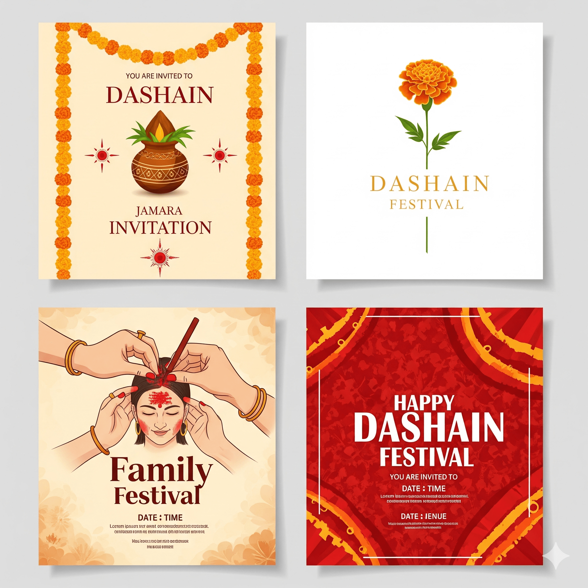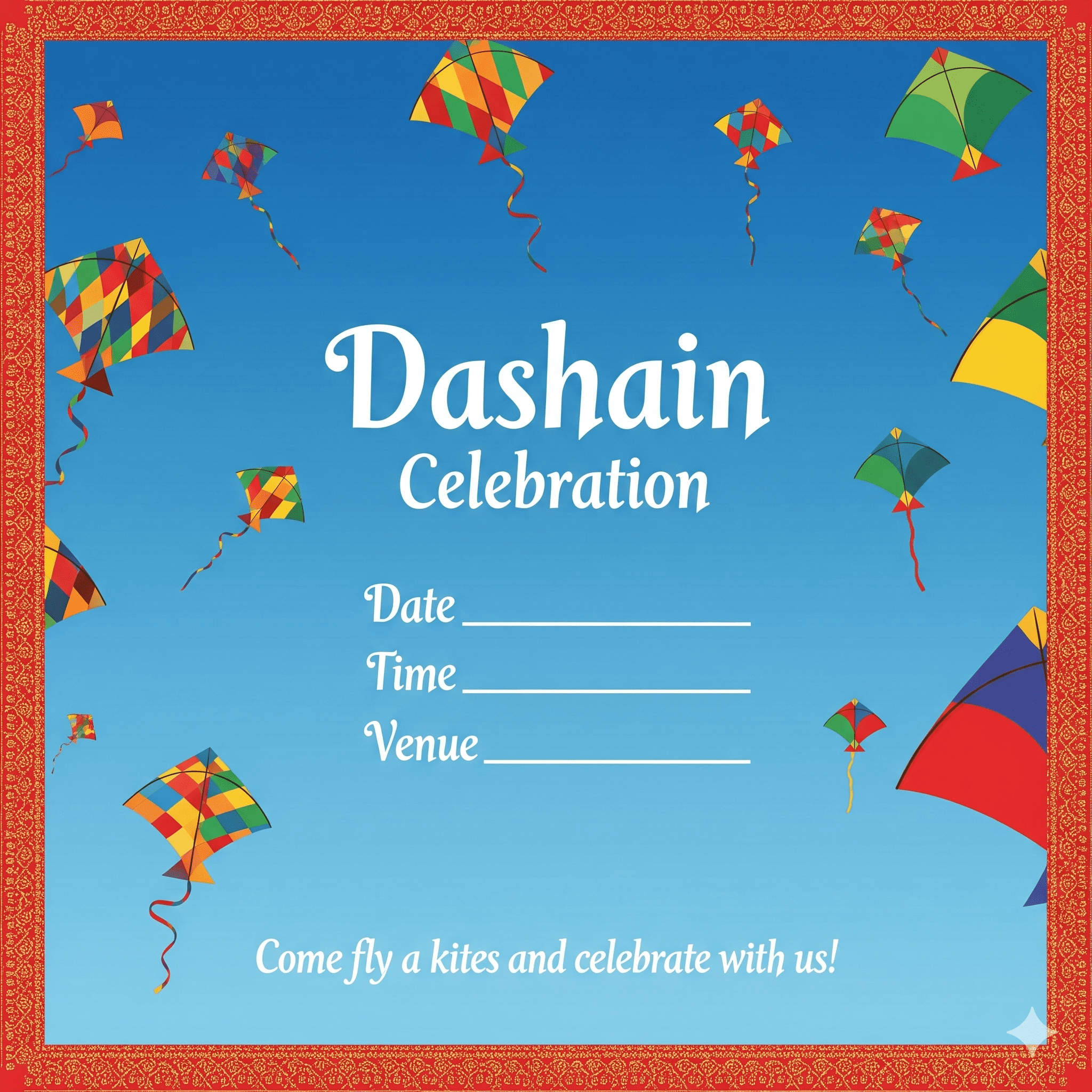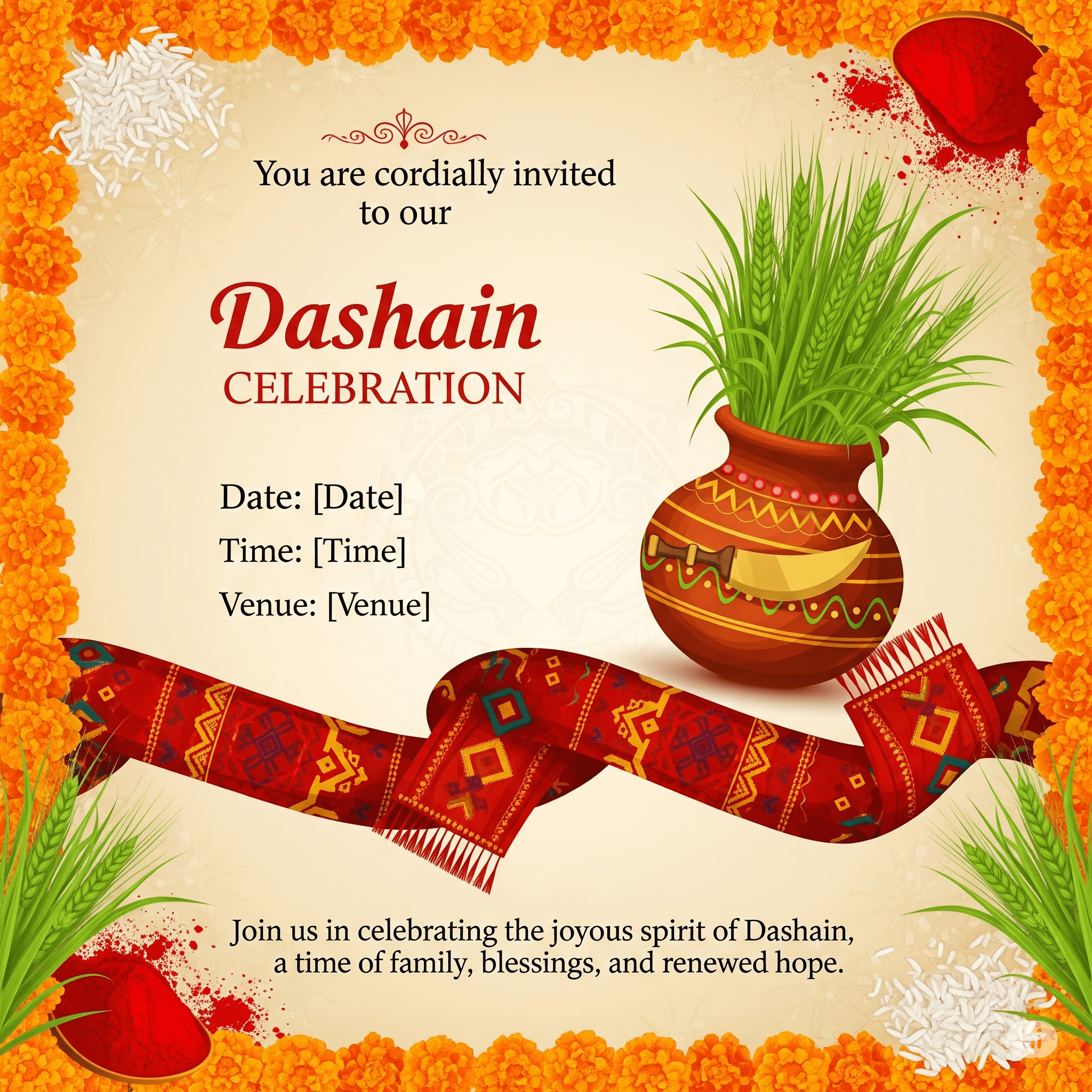 Celebrate Nepal’s biggest festival with style using our Joyful Dashain invitation template. Designed to capture the spirit of family gatherings, blessings, and cultural traditions, this template makes it easy to create stunning invites in minutes. Whether you’re hosting a small puja at home or a grand gathering, these customizable Dashain invitations let you add your personal touch with colors, fonts, and festive graphics.